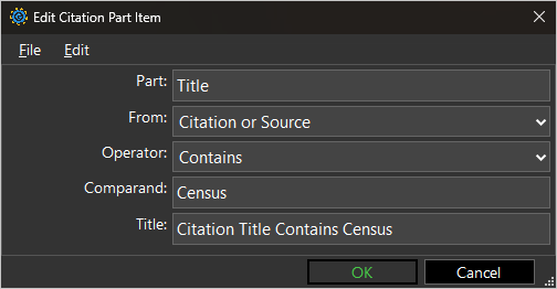 Use the Citation Part term to filter Citations based on one of their part values. Returns true when the part's value passes the filter condition described by the term's comparison properties.